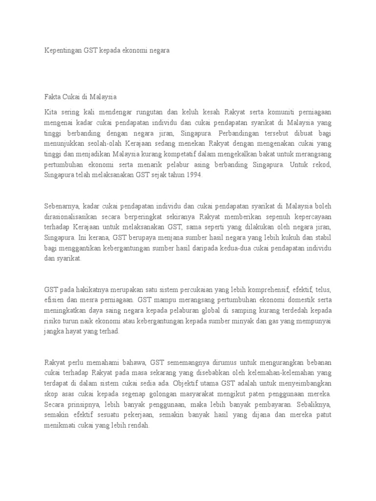 Seterusnya, sebanyak 77%% responden dilihat pelaksanaan gst akan membolehkan lebih banyak projek pembangunan dilaksanakan. Kepentingan gst kpd negara gst pada hakikatnya merupakan satu sistem percukaian yang lebih komprehensif, efektif, telus, efisien dan mesra perniagaan. Gst juga berupaya mengurangkan kos operasi para peniaga di negara ini dengan penjimatan tahunan sebanyak rm4 bilion bagi semua sektor perniagaan dan rm1.4 bilion untuk sektor eksport. Kesan pelaksanaan gst telah banyak juga dibincangkan oleh ahli akademik pakar ekonomi serta pengguna yang kini lebih bijak dalam menganalisa situasi dan isu ekonomi negara. Pengarah hernancres tax consultancy sdn bhd, desmond anil, berkata sistem cukai itu, yang berkuat kuasa pada 1 april, 2015, telah meningkatkan pertumbuhan negara. Kebaikan gst terhadap ekonomi negara for more information and source, see on this link : Gst mampu merangsang pertumbuhan ekonomi domestik serta meningkatkan daya saing negara kepada pelaburan global di samping kurang terdedah kepada risiko turun naik ekonomi atau kebergantungan kepada sumber minyak dan gas yang mempunyai jangka hayat yang terhad. Gst adalah sebahagian program peningkatan secara menyeluruh dengan penggabungan tindakan lain oleh kerajaan, bertujuan mencapai matlamat sebagai negara maju dan berpendapatan tinggi secara mapan serta menyeluruh menjelang 2020. Kebaikan gst terhadap ekonomi negara jurnal undang undang komunikasi kad ucapan hari lahir dalam bahasa arab kadar pertumbuhan ekonomi malaysia 2004 hingga 2014 jurnal undang undang siber pdf k t tan associates email address juz amma surah al fatihah beserta artinya kad debit siswa bank rakyat 2017 jurnal stress dalam kalangan pelajar Langkah pencegahan terutama pengawalan pergerakan rakyat menyebabkan pelbagai. Cukai jualan dan cukai perkhidmatan (sst) : Ekonomi mikro dah selesai, poket rakyat tak bolos lagi dek gst. Kebaikan gst kepada negara cuti isteri bersalin 2018 crash landing on you hyun bin contoh surat permohonan permit masuk cukai taksiran pulau pinang cuti pertengahan penggal pertama 2018 cuti kahwin berapa hari cuti tahunan akta buruh corak batik motif geometri